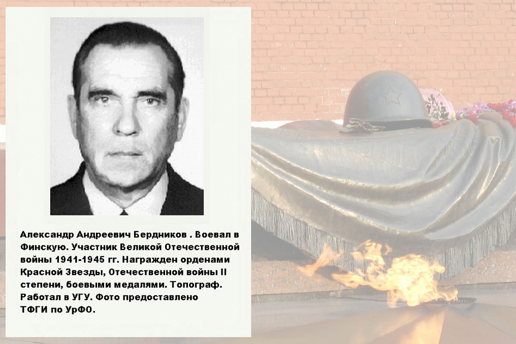 Валентин Васильевич Уфимцев. Участвовал в Сталинградской битве, в сражении на Курской дуге, в форсировании Днепра, в освобождении Румынии, Венгрии, Чехословакии. Награжден орденом Красной Звезды, боевыми медалями. После войны работал в УГУ.